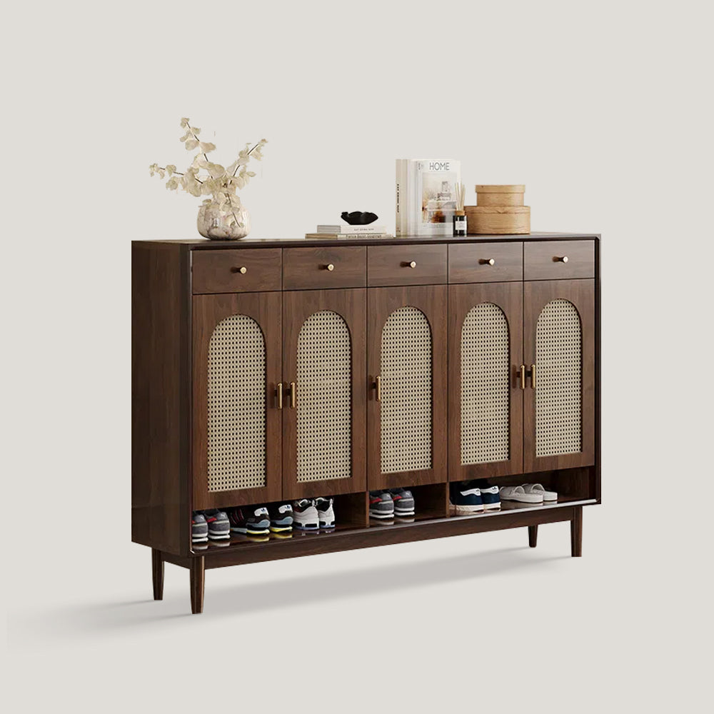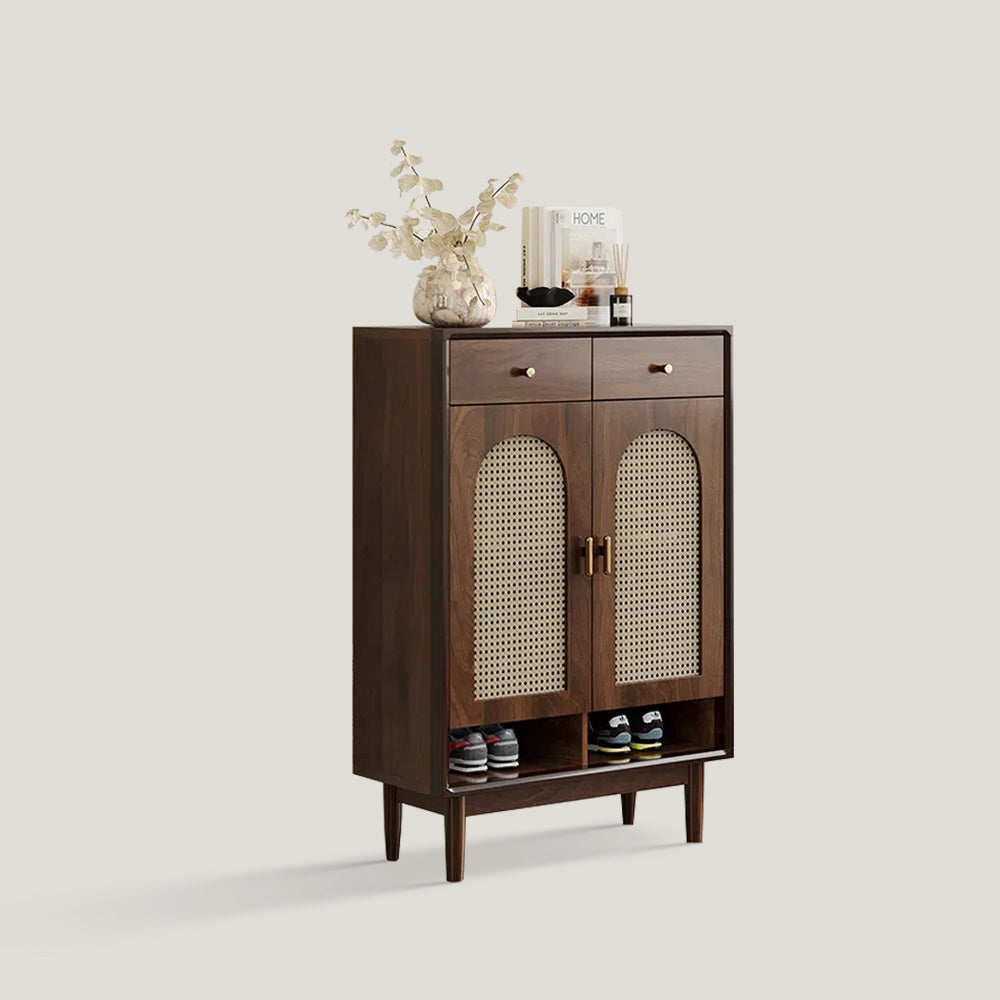 The door panel of the shoe cabinet is made of hand woven rattan material, which not only increases breath ability and prevents shoe odors, but also adds unique textures and visual effects, making the furniture more artistic.
