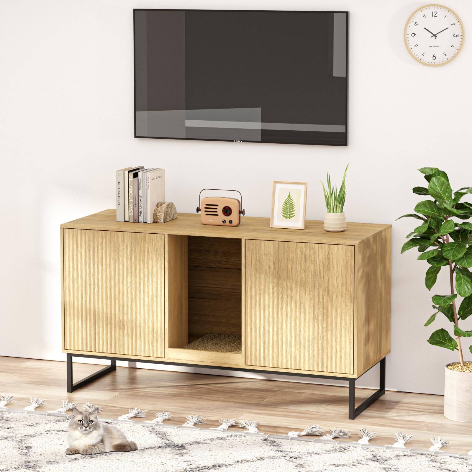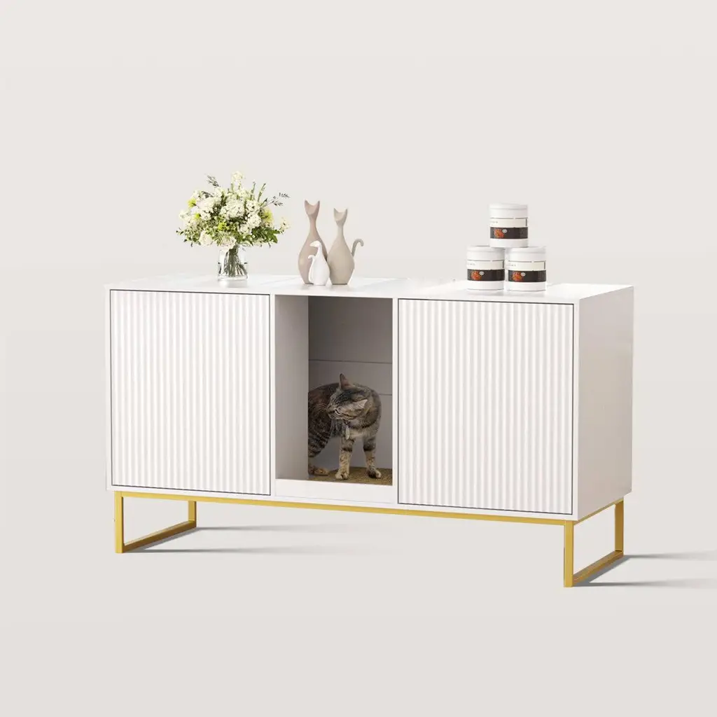 Modern hidden cat litter box enclosure to give your cat a private space while elevating your home’s style. Its elegant design blends with your home decor, keeping your space tidy and organized, all while giving your cat a cozy retreat, seamlessly hiding your cat’s litter box while reducing unpleasant odors. The furniture hidden is crafted from high-density MDF board and features sturdy metal shelves frame, ensuring exceptional durability and stability.
