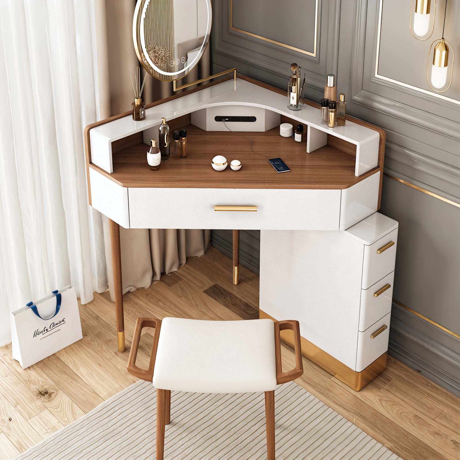 Designed to sit close to the corner of a bedroom or living room, the corner dresser features solid pine drawers, solid ash legs with gold foot caps and a microfiber leather upholstered stool for a luxurious and elegant look. It doesn’t take up much space and makes full use of the corners of the room.
