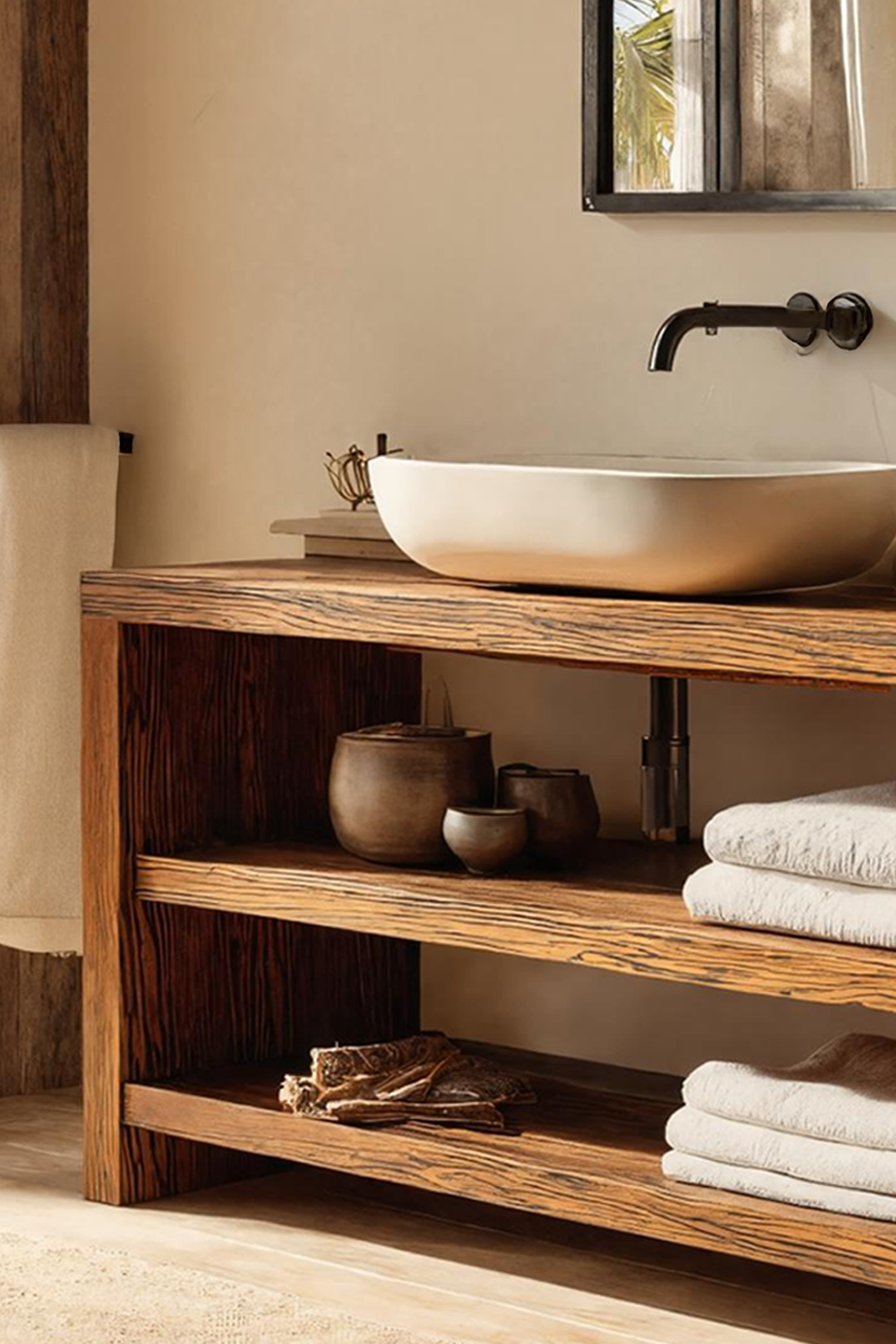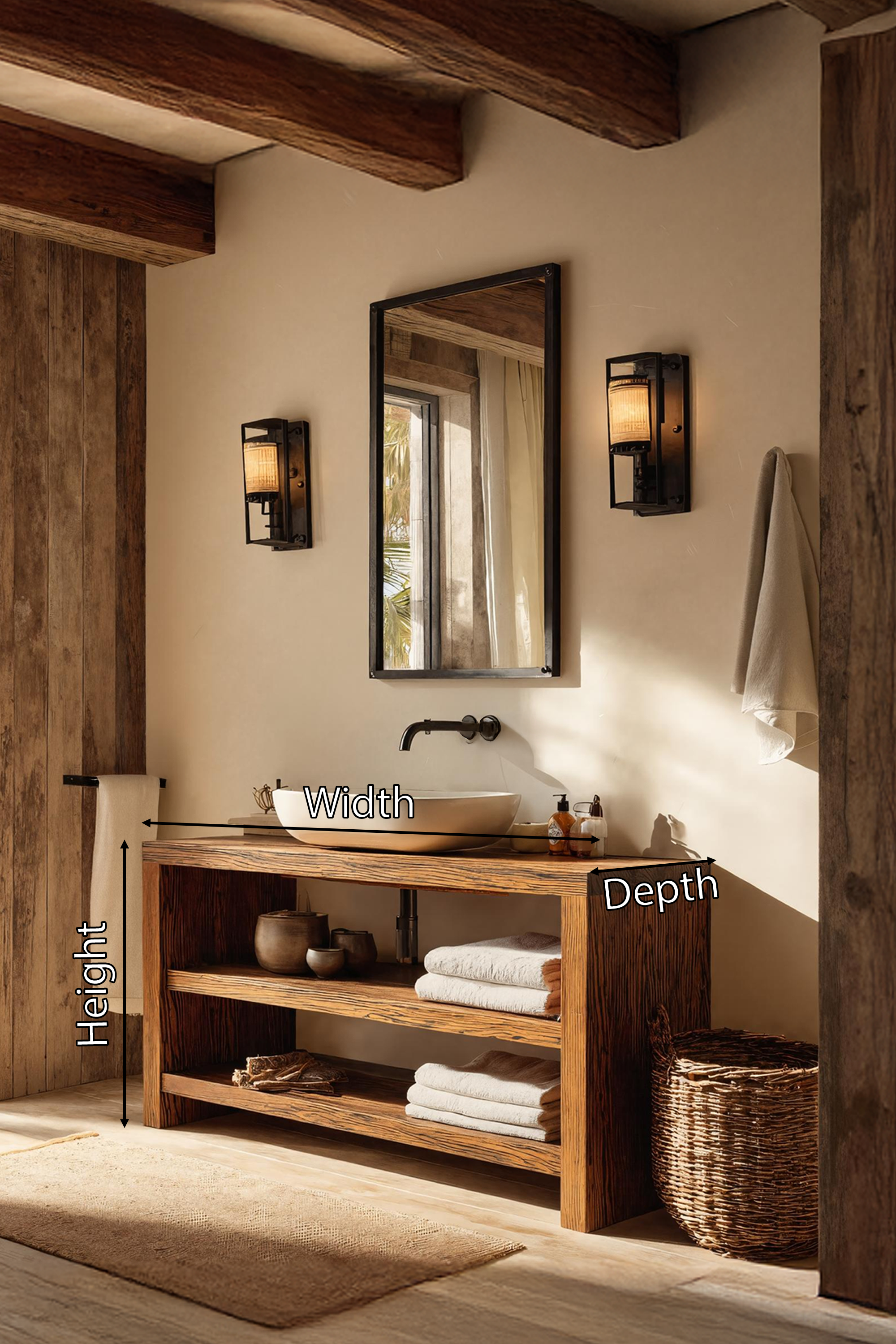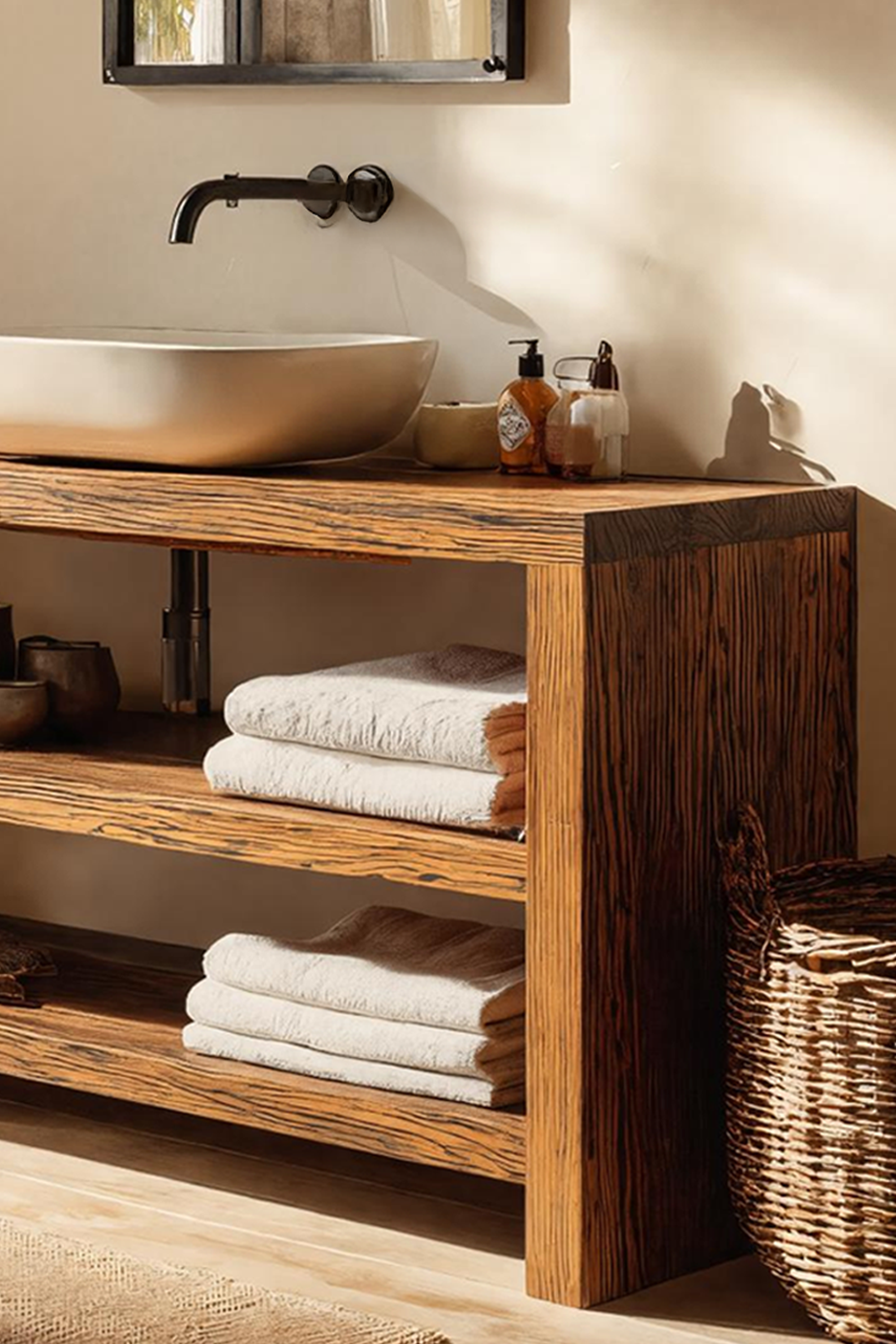 Enhance your bathroom with the Farmhouse Wooden Vanity For Cozy Bathroom Spaces, carefully crafted from solid wood and featuring a charming live-edge design. Combining artisanal craftsmanship with practical storage, this vanity adds both style and functionality, creating a warm, inviting, and naturally elegant atmosphere in any bathroom interior.