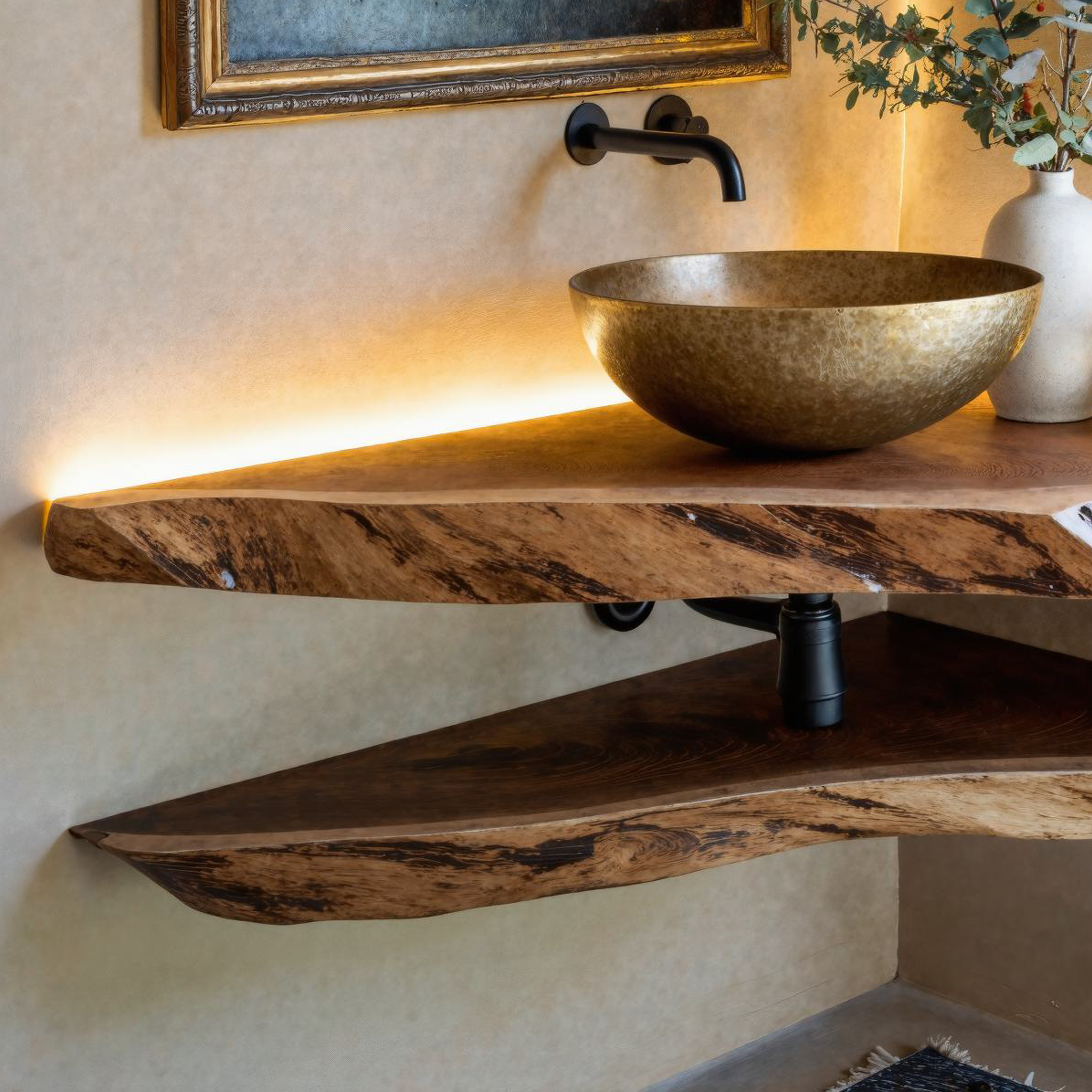 A bathroom vanity shelf blends natural elegance with practicality, bringing warmth and style to your bathroom while providing essential storage space.