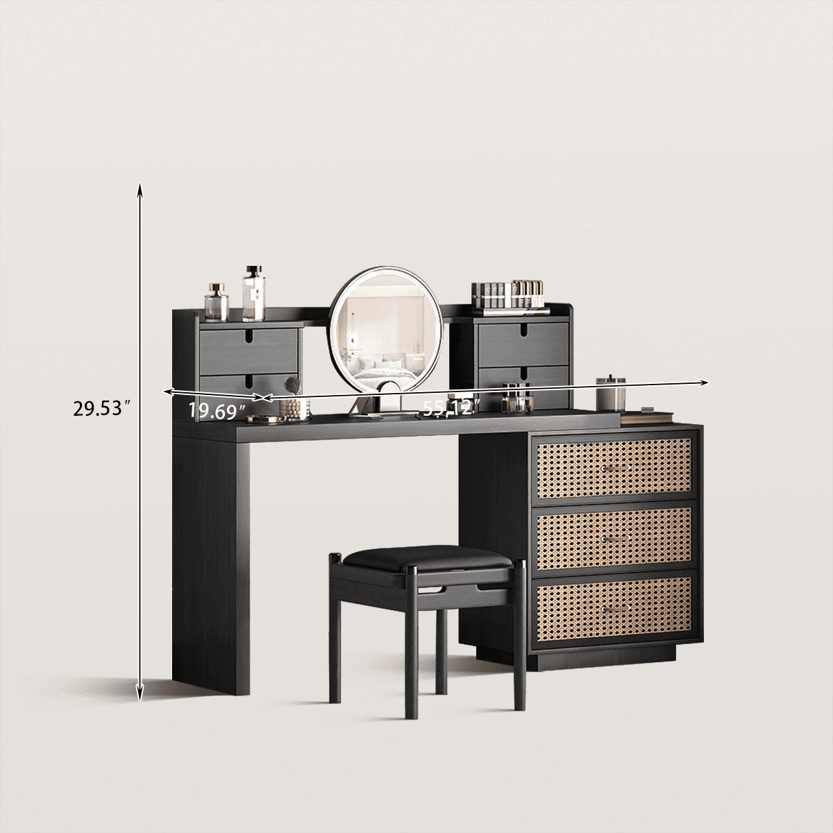 Be the first to review “Mid-Century Rattan Drawer Makeup Vanity with Round LED Mirror” Cancel reply