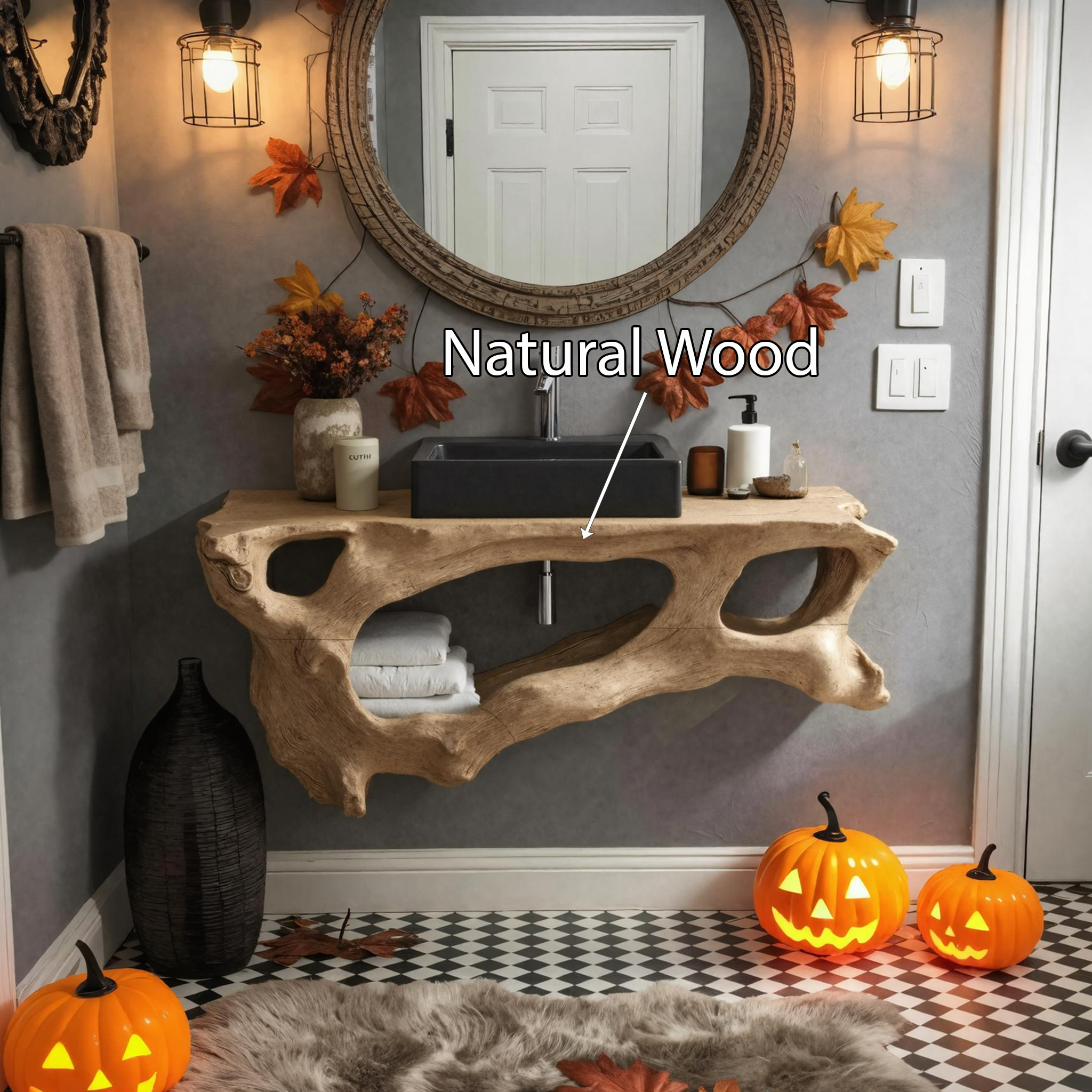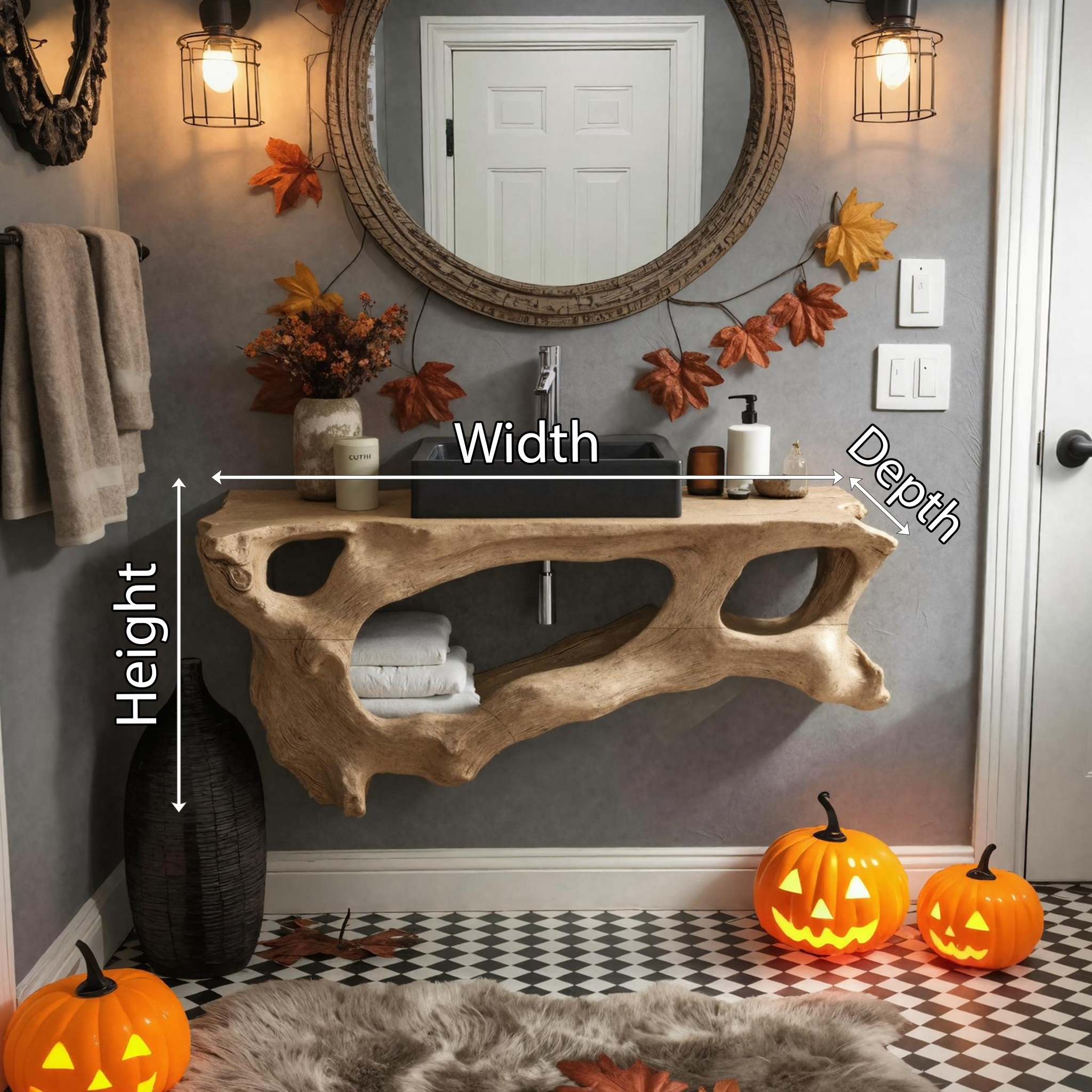 The Mid Century Solid Wood Vanity for Bathroom Halloween Furniture combines rustic charm with practical functionality, making it an ideal choice for transforming your space. Its timeless design and sturdy construction ensure it will remain a standout feature in your bathroom for years to come. Perfect for anyone looking to enhance their bathroom with a piece that balances elegance, durability, and seasonal character.