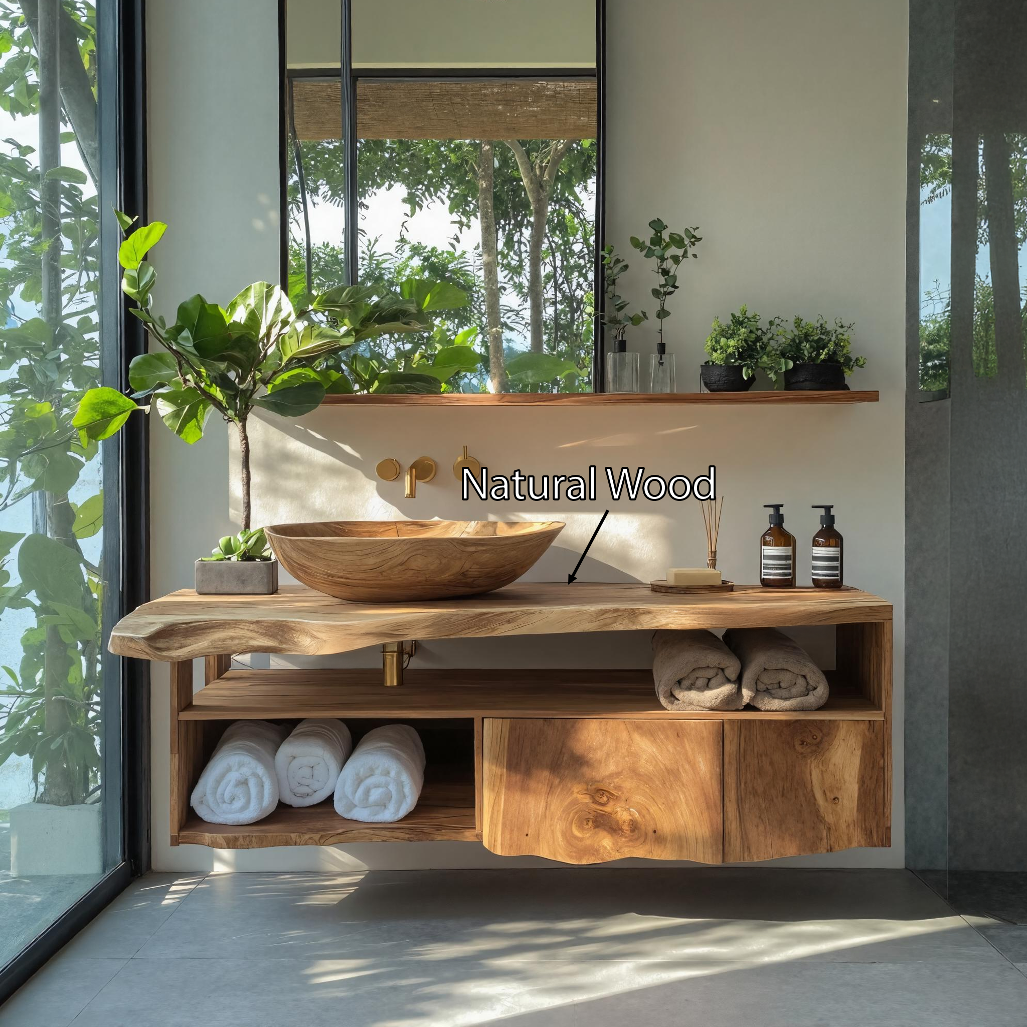 Crafted entirely from solid, rustic natural wood, each vanity is a testament to authentic craftsmanship. Variations in grain, tone, and shape are natural features of the material, ensuring your piece is unique. The images shown are examples — your vanity will have its own individual markings and character.