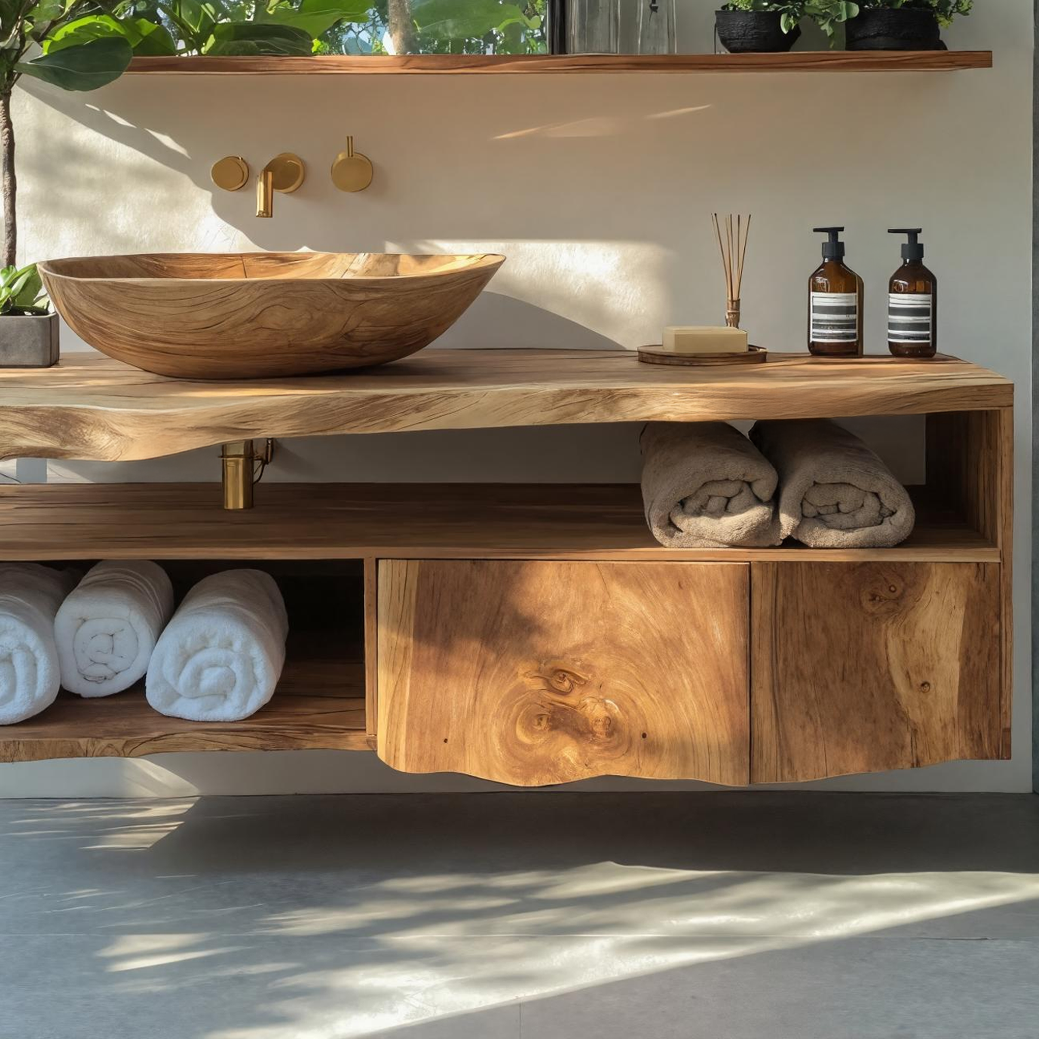 Each vanity showcases the natural beauty of solid wood, with distinctive grain patterns, organic edges, and unique textures that ensure no two pieces are alike. Every curve and contour celebrates the character of the timber, making your vanity truly one of a kind. Finished to highlight the wood’s warmth, it adds depth and elegance to your bathroom.