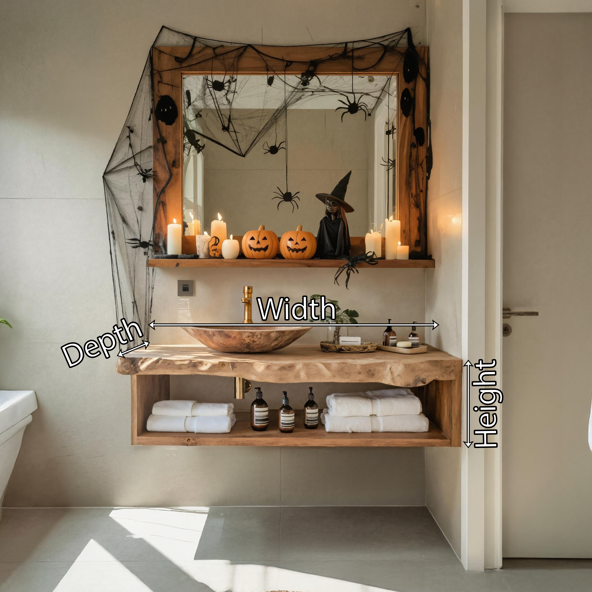 Bring seasonal elegance into your space with the Mid Century Wooden Live Edge Bathroom Shelf For Bathroom Halloween Decor, a handcrafted piece that marries timeless mid-century design with the raw beauty of natural wood. Featuring a striking live-edge profile, this shelf not only offers practical storage but also becomes a stylish focal point, adding warmth and a touch of Halloween-inspired charm to your bathroom interior.