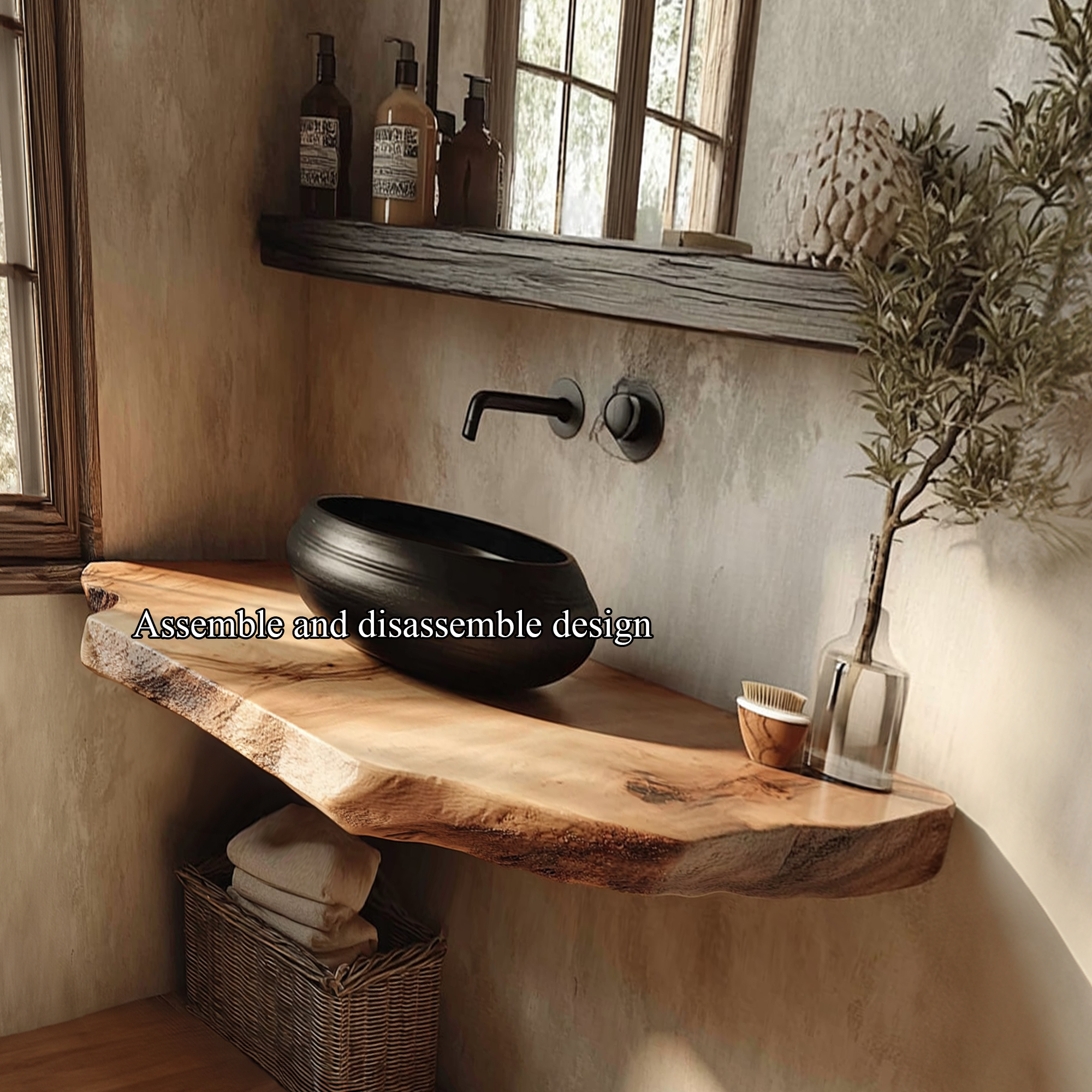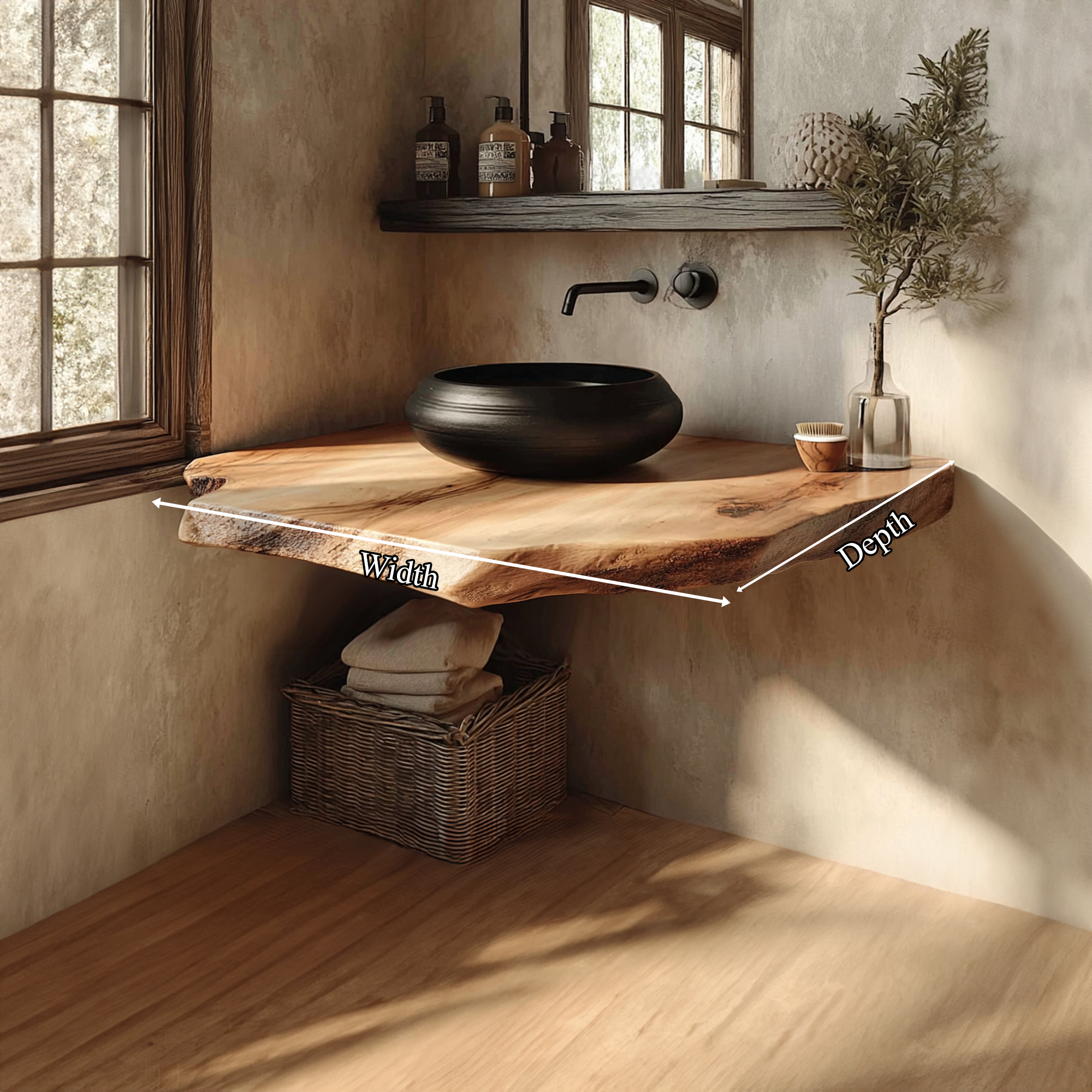 Refine your small space with the Midcentury Floating Shelf Natural Edge Vanity Powder Room, a handcrafted piece that blends sleek mid-century design with organic wood beauty. Built from solid timber and finished with a striking natural edge, each vanity highlights unique grains, textures, and variations that make it truly one of a kind. Its floating shelf style offers space-saving practicality and timeless sophistication, making it the perfect centerpiece for any powder room.