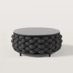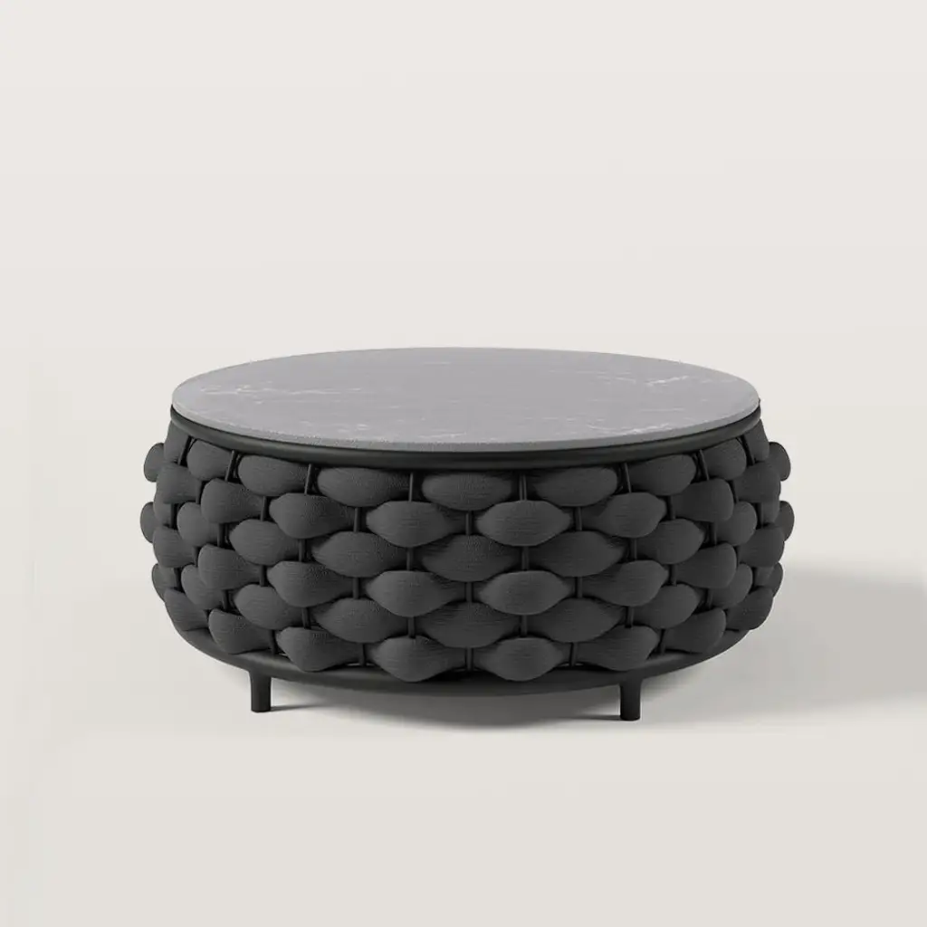 Transform your outdoor living space with this stylish and practical round coffee table. Featuring a durable sintered stone top and a woven aluminum rope base, it offers a unique visual and tactile experience. The grooved base with a smoked ash finish and a stunning marble top adds natural elegance, making it a perfect spot to enjoy a book or a cold drink.