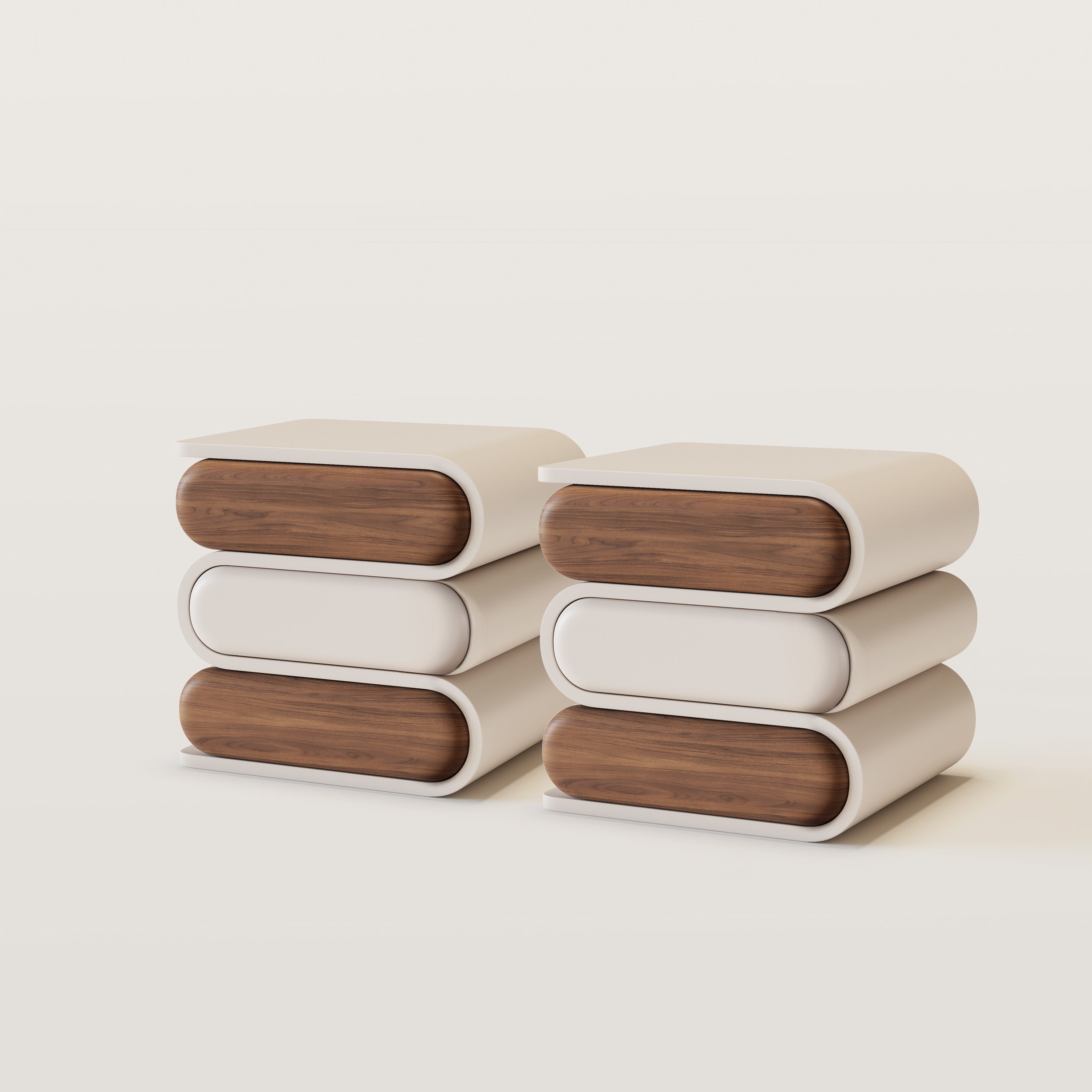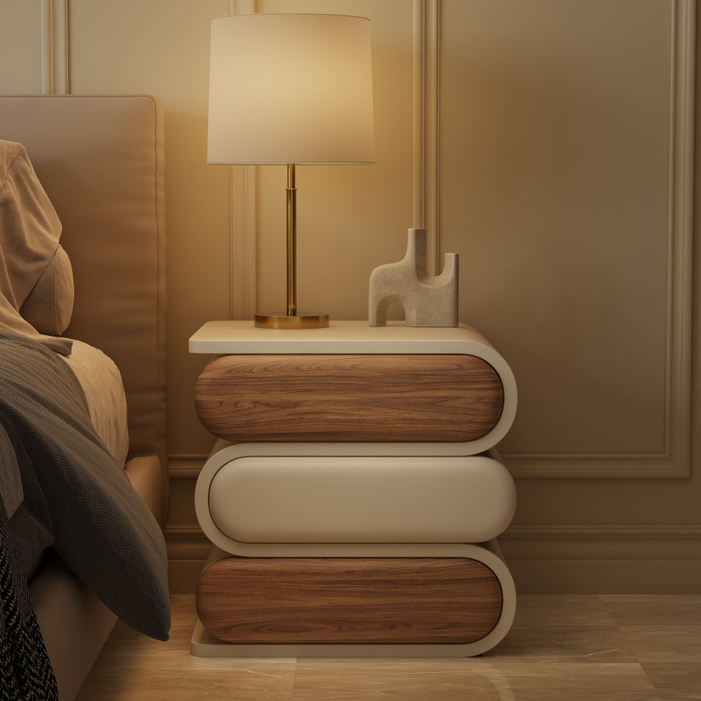Enhance your bedroom decor with our modern minimalist beside table or named nightstand, designed to blend seamlessly with any contemporary living space. Crafted with a smooth, white exterior and natural wooden drawers, this bedside table not only offers a chic aesthetic but also provides ample storage space. The curved design adds a touch of elegance, making it a perfect addition to your modern home.