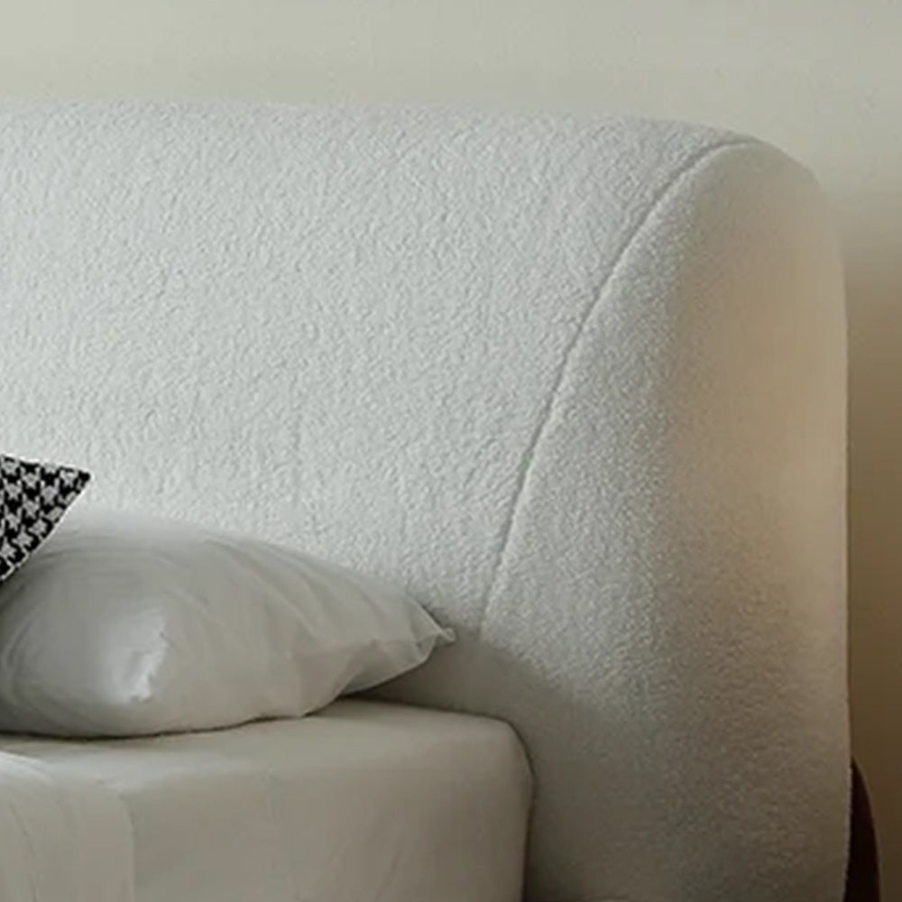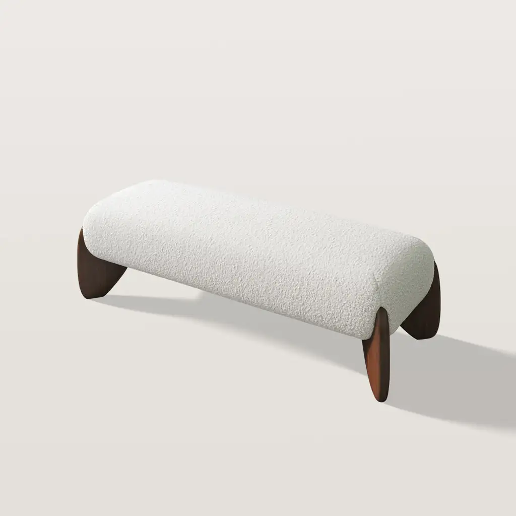 Modern boucle platform bed with an elegant bedroom bench with a soft boucle seat and solid rubber wood legs. The luxurious feel in the fabric and strength in the legs caters to both aesthetic and practical needs. The bench works great in a bedroom, hallway, or living room and is a perfect sitting place to add grace and modernity to any space. This bed provides a chic, comfortable solution for a good night’s sleep.