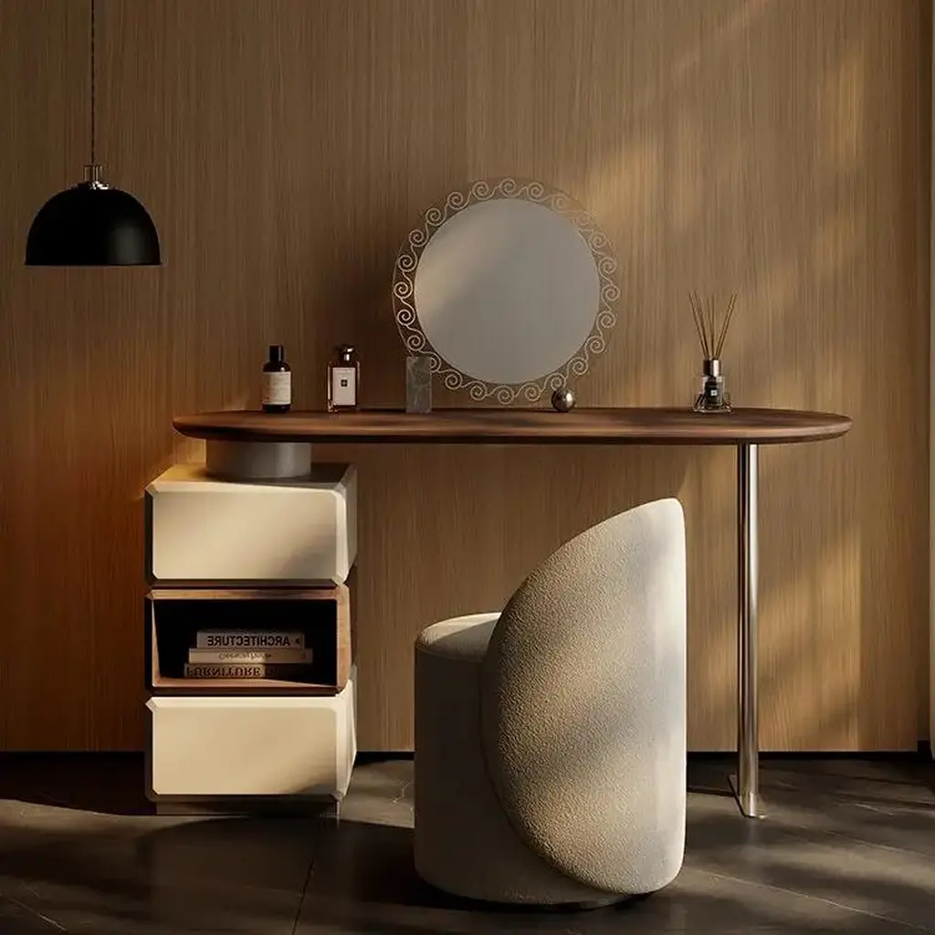 Elevate your beauty routine with this modern oval makeup vanity, designed to combine style and functionality seamlessly. The sophisticated walnut finish adds a touch of elegance to any room. Featuring a beautifully decorated mirror, this vanity provides a chic focal point for your makeup space. The vanity includes multiple storage drawers, ensuring ample space for organizing all your makeup, skincare products, and accessories. The sleek design with a combination of wood and metal elements enhances its contemporary look. The accompanying plush stool offers comfortable seating, making your beauty regimen a relaxing experience.