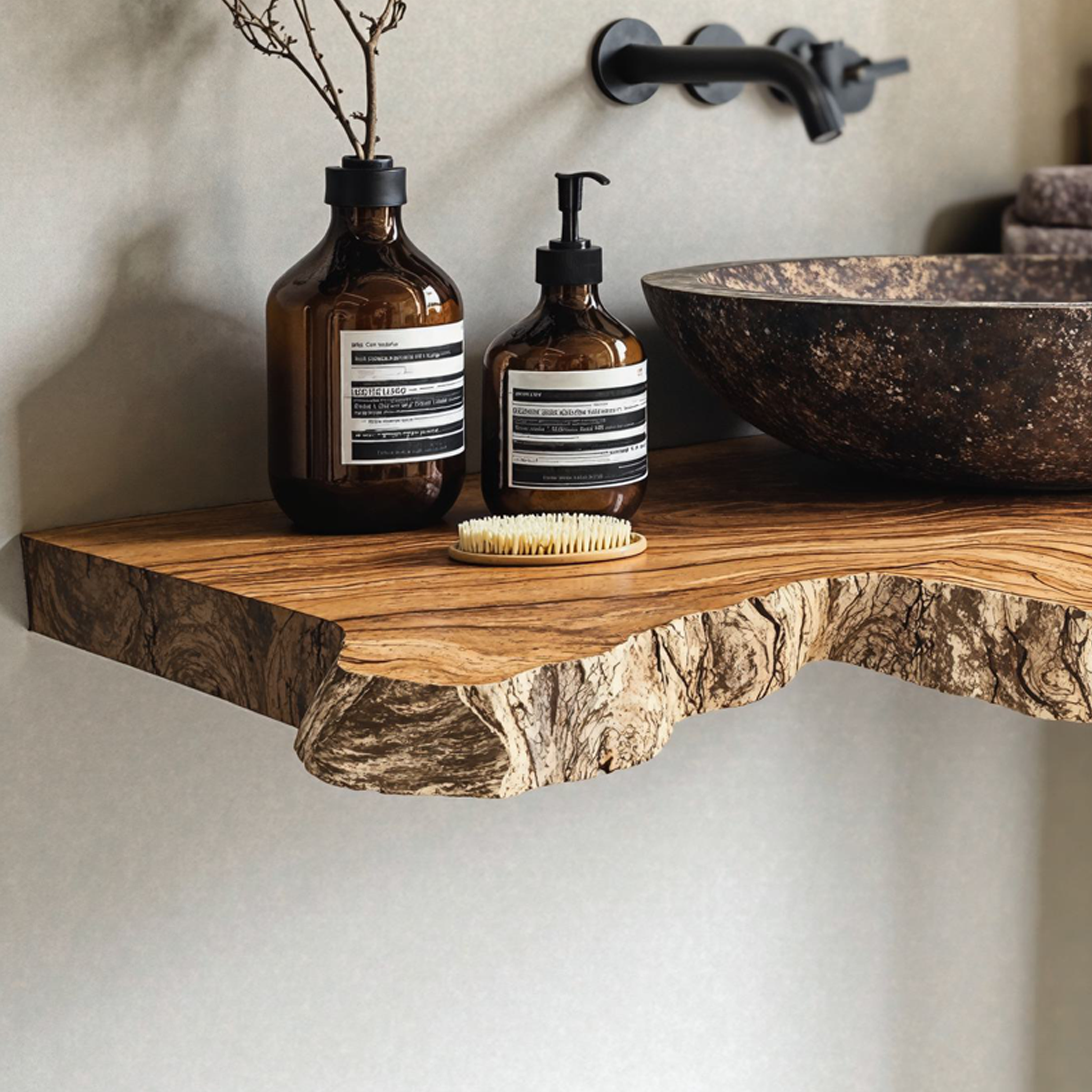 A bathroom vanity shelf blends natural elegance with practicality, bringing warmth and style to your bathroom while providing essential storage space.