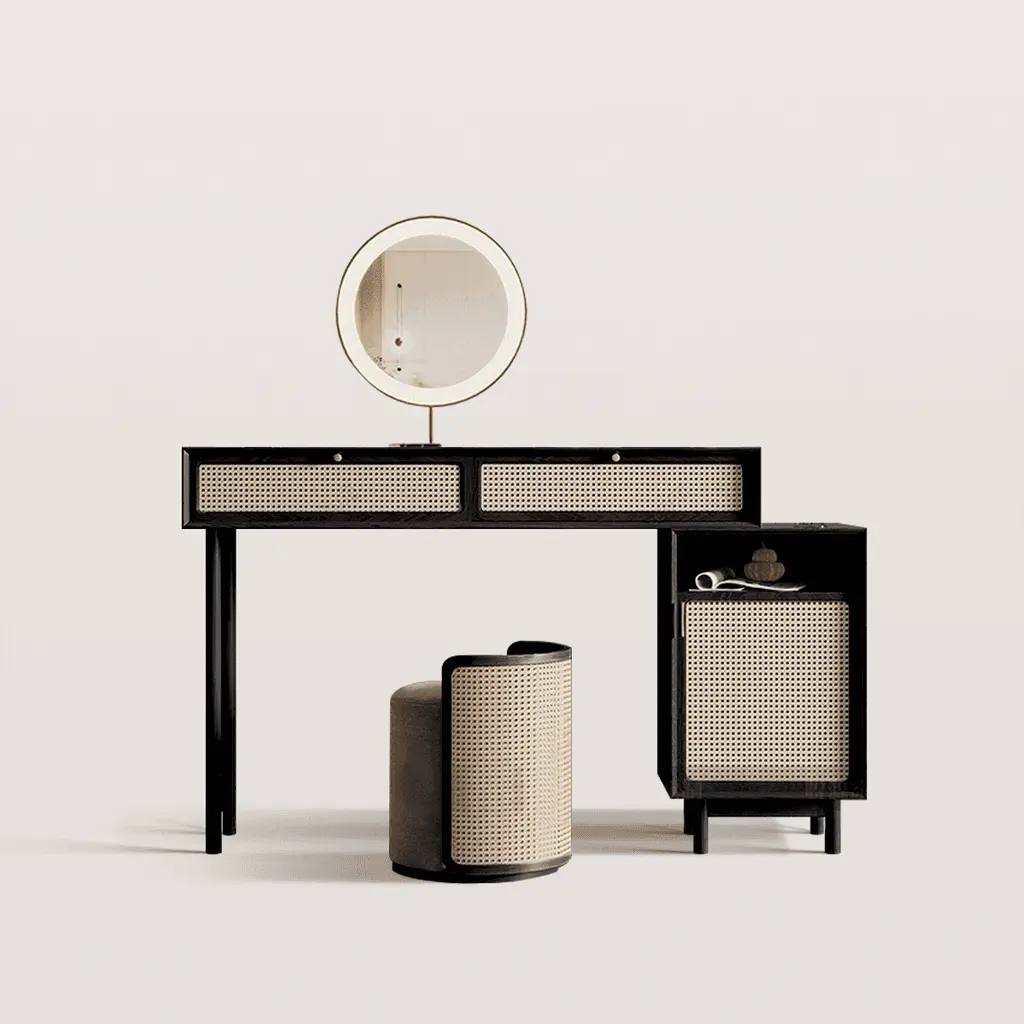 The same rattan element dressing stool provides a comfortable and breathable sitting experience, with a height that matches the tabletop. It allows for easy sitting without fatigue, while also balancing visual unity and practicality.