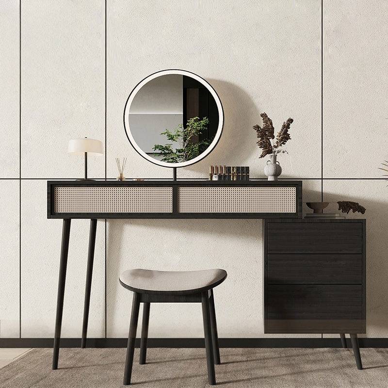 Rattan Makeup Vanity with Round Mirror and Storage Drawers
