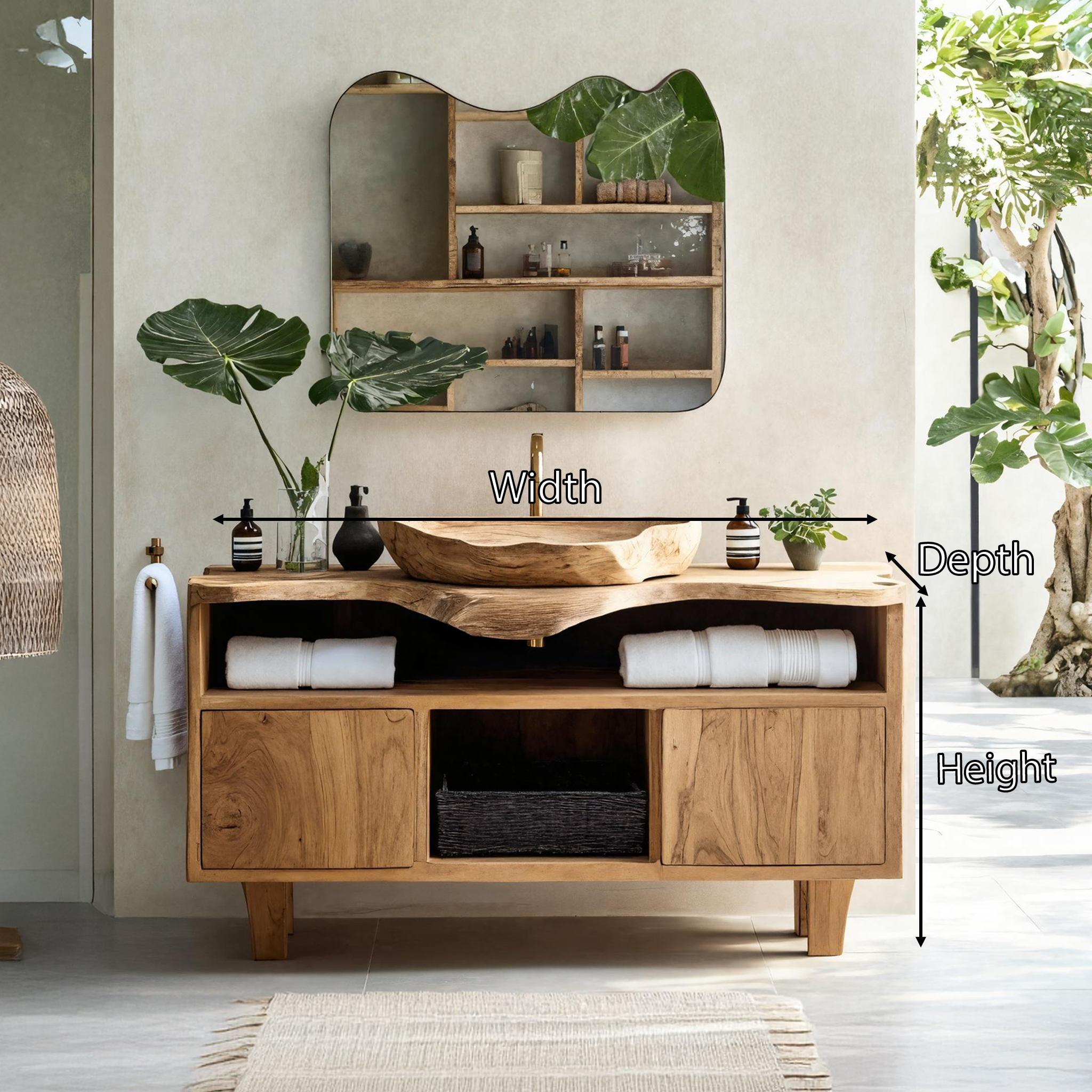 Elevate your bathroom with the Rustic Bathroom Vanity For Natural Home Aesthetic, handcrafted and assembled from solid rustic wood. Combining the raw beauty of natural materials with functional storage, this vanity adds warmth, texture, and practicality to any modern living space. Its distinctive live-edge design and polished finish create a captivating focal point that enhances both style and comfort.