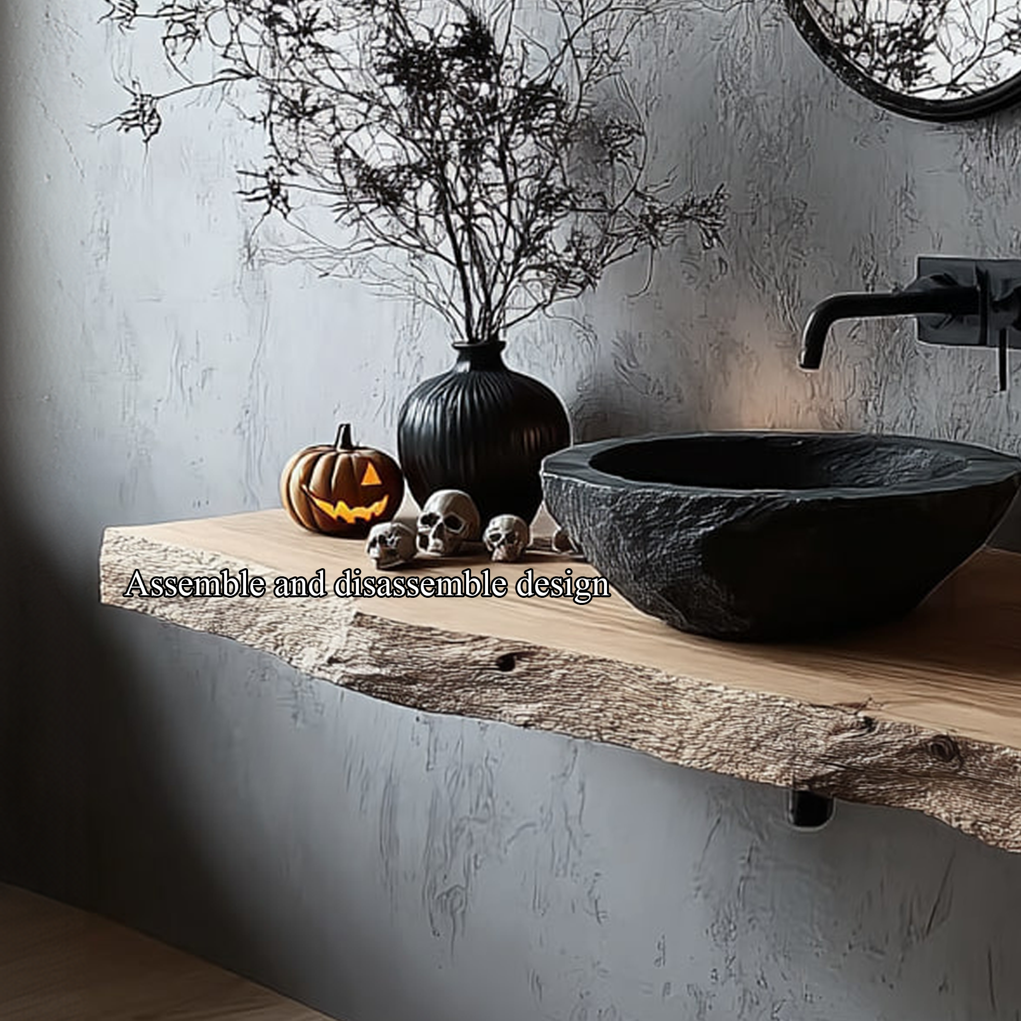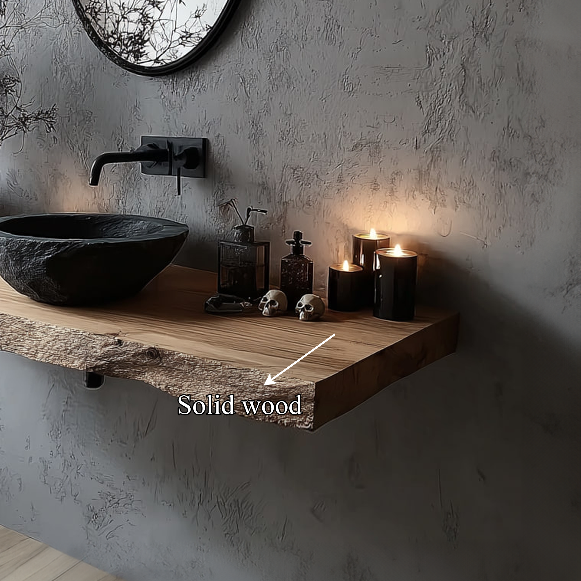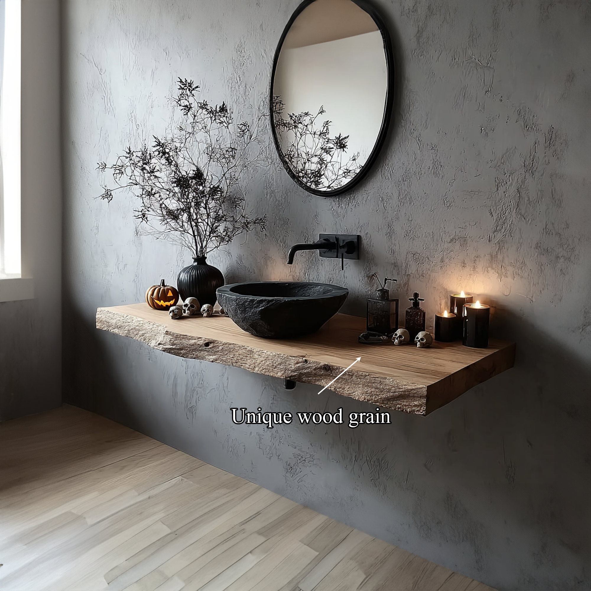 Transform your space with the Rustic Floating Shelf Basin Vanity Bathroom, a handcrafted piece that merges rustic charm with modern functionality. Built from reclaimed wood and finished with a natural live edge, each vanity showcases unique grains, knots, and organic textures for a one-of-a-kind look. Its floating shelf design with basin-ready construction offers both practicality and timeless rustic elegance, making it a perfect centerpiece for any bathroom.