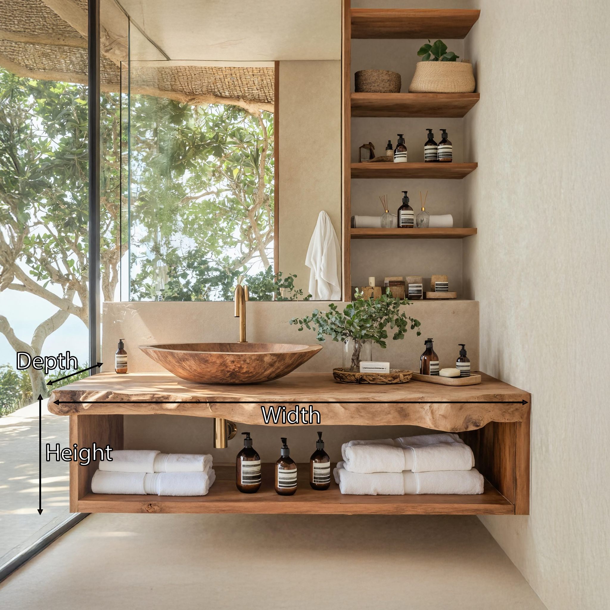 Crafted entirely from solid, rustic natural wood, each vanity is a testament to authentic craftsmanship. Variations in grain, tone, and shape are natural features of the material, ensuring your piece is unique. The images shown are examples — your vanity will have its own individual markings and character.