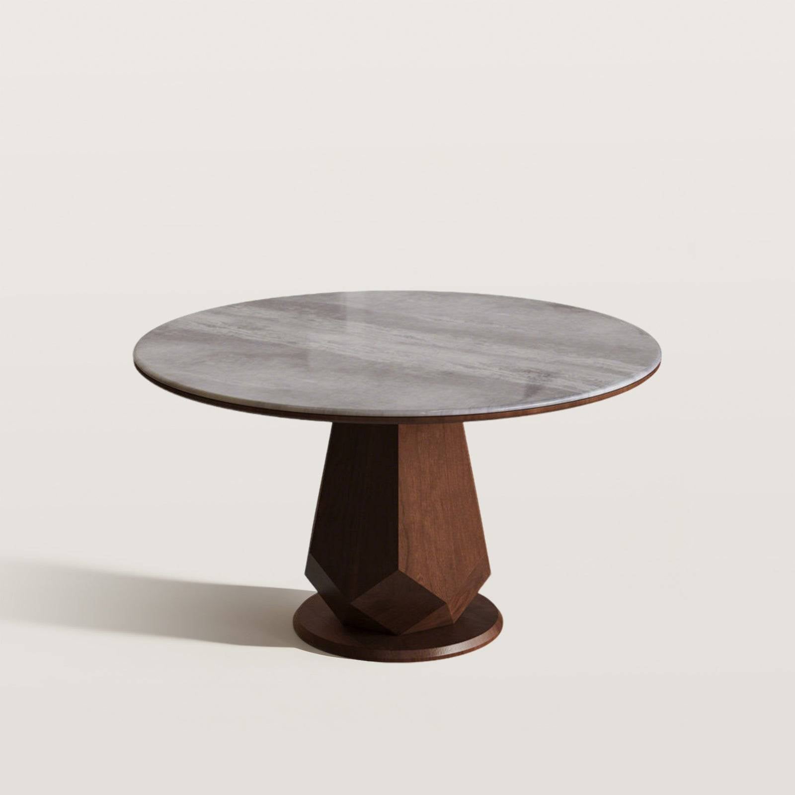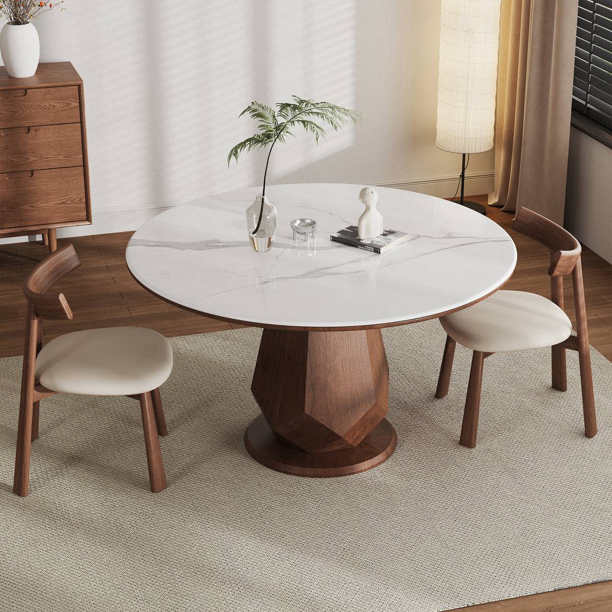 This round dining table features a delicate stone texture design on the desktop, offering two color options: white and gray. The texture is natural and smooth, giving it a high-end stone look and making it more suitable for daily use and maintenance. The rounded desktop lines create a soft spatial atmosphere, making it more intimate and comfortable for family or guests to sit around. The base is made of solid wood and manufactured wood, with a stable and sculptural geometric cut shape, giving the overall strong visual focus and excellent load-bearing stability.